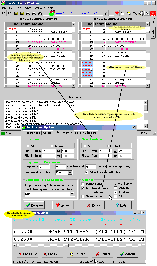 File- and folder-editing features allow a quick fix of the discrepancies found by QuickSpot. A scrolling line-container lets you compare any 2 lines and shows all differences between them, character by character. You can deal with any discrepancy found right on the spot. In addition, there is a find/replace option and support for copying/merging text between the 2 files; files can also be saved and printed. In the folder-section, individual files can be viewed/opened, deleted, renamed, moved or copied.